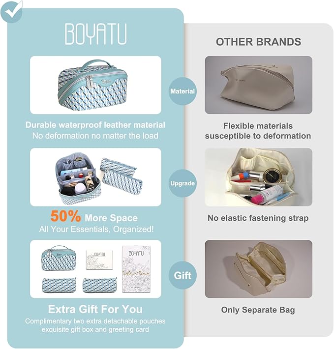 - Travel Makeup Bag Set of 3: This BOYATU travel makeup bag with five compartments comes with two small makeup pouches, ensuring optimal organization for your skincare products and cosmetics. Nice for your travel, business trips, vacations, outdoor activities and picnics.