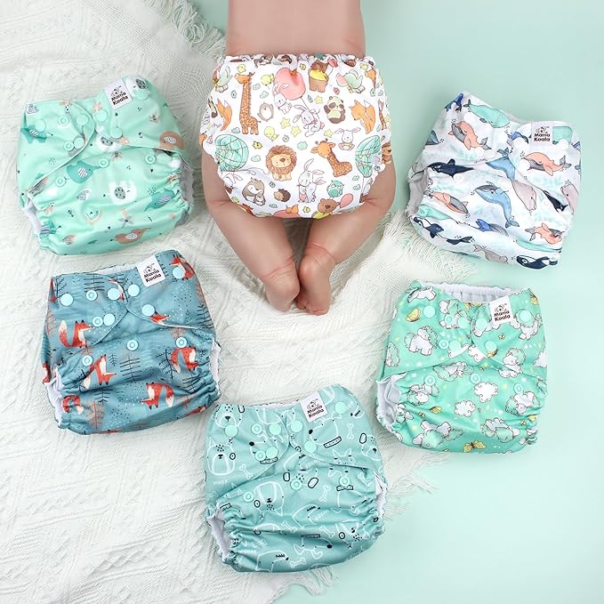 Mama Koala 3.0 Pocket Cloth Diapers for Babies with AWJ Lining, 6 Pack with 6 4-Layer Natural Cloth Diaper Inserts - Reusable and Washable Pocket Diapers (Adorable Animal)