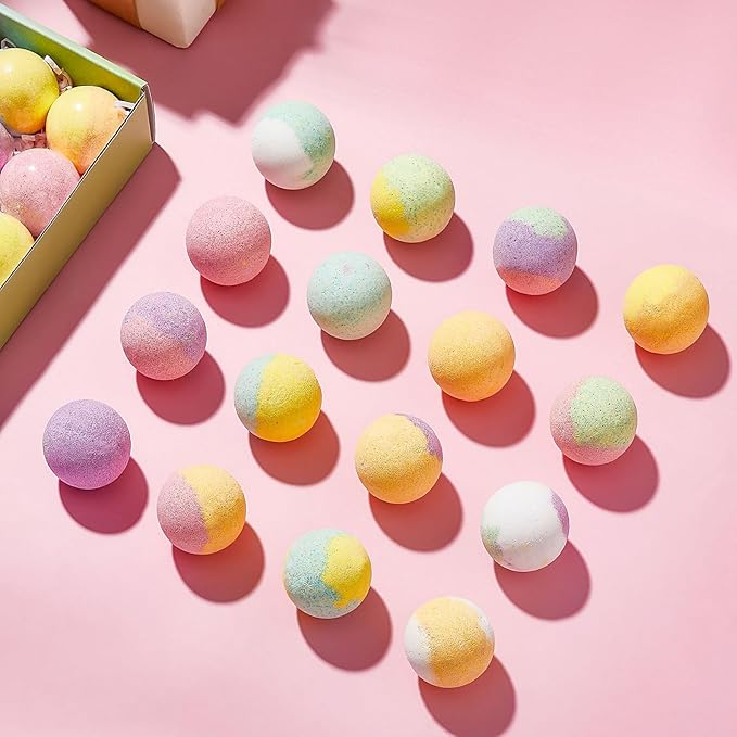 - NATURE, SAFE AND HEALTHY: 16 hands made bath bombs with natural ingredients to moisturize dry skin and for relaxing, fun and fizzy.No toxic fragrance and it's safe for everyone. All bombs are completely soluble in water, No coloring will stain your skin nor your tub.