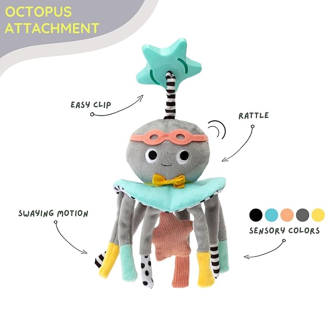 - Ollie the Octopus Mobile Attachment: Say hello to Ollie, your new mobile sidekick; This plush octopus attaches to the sensory rod, transforming it into a portable mobile; Ollie is super soft, and thanks to the gentle baby safe chime in its head, it creates a calming sensory experience that’ll keep baby happily occupied at home or on trips around town