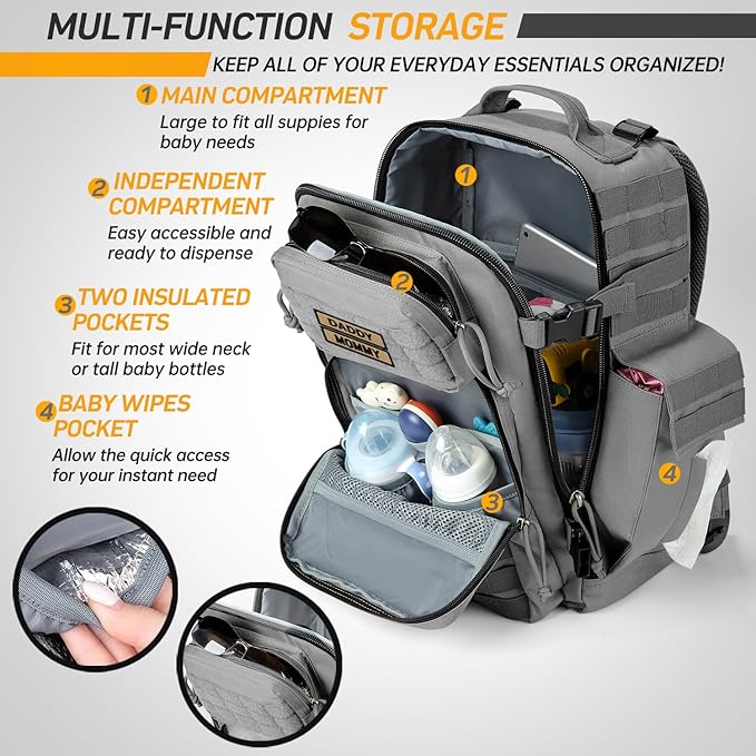 - Thoughtfully Designed for Dad: This bag comes with two insulated bottle pouches, dedicated wipe and water bottle side pockets, and a spacious area for a blanket. The unique insulated back layer is perfect for wet items or a water bladder, ensuring easy access to all baby essentials, including a convenient changing pad.
