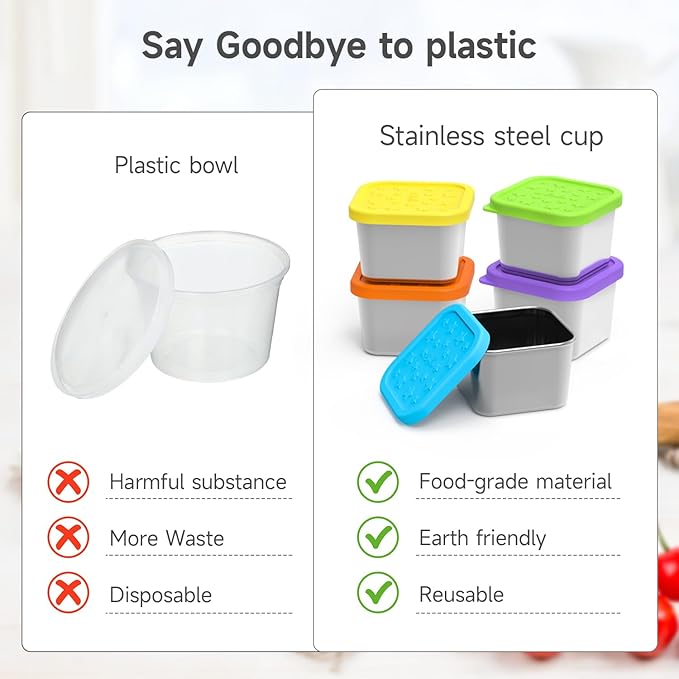 - Easy to Clean and Reuse: You can simply put the containers and lids on the top rack of the dishwasher and cleaning becomes a hassle-free task, saving both time and effort. The snack containers are reusable which can replace disposable food cups to reduce the impact on environment. They also can be stacked inside each other with the lids off when not in use, saving space in the drawer or cabinet.