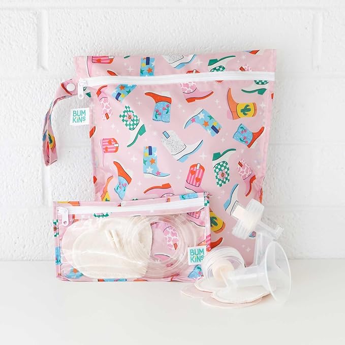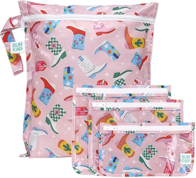Bumkins - Waterproof Wet Bag & Clear Travel Bags - For Beach, Baby, Travel, Swim Suit, Cloth Diapers, Pump Parts, Pool, Gym, Toiletries - Reusable & Easy to Clean - Cowgirl Boots - 4 Pack