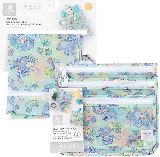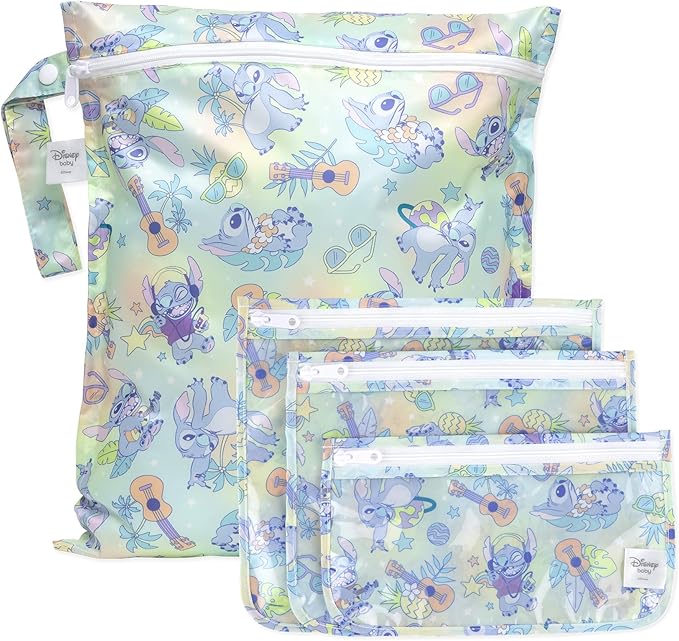 Bumkins - Waterproof Wet Bag & Clear Travel Bags - For Beach, Baby, Travel, Swim Suit, Cloth Diapers, Pump Parts, Pool, Gym, Toiletries - Reusable & Easy to Clean - Disney Stitch - 4 Pack