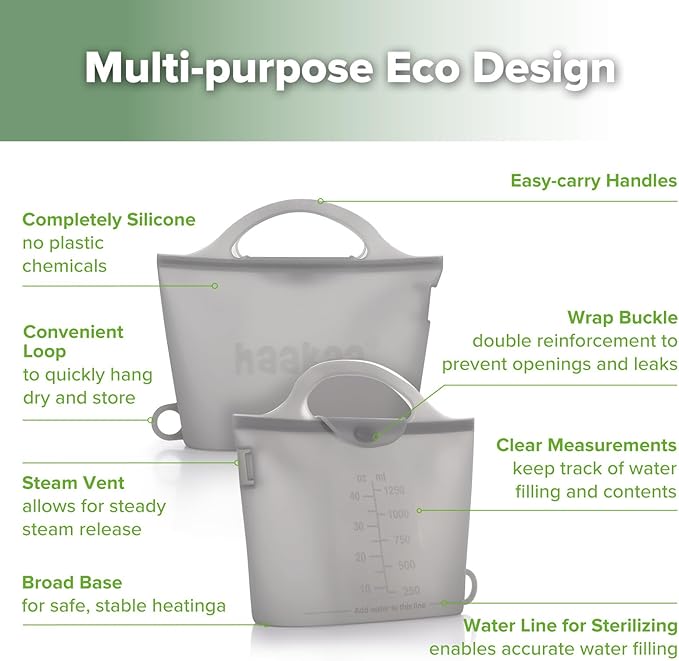 - TRAVEL-FRIENDLY & COMPACT: Haakaa’s lightweight, flexible silicone sterilizer bags roll up neatly into a compact size that fits easily into most bags, making them ideal for busy parents who need quick sterilizing on-the-go.