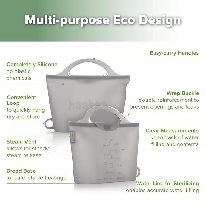 - TRAVEL-FRIENDLY & COMPACT: Haakaa’s lightweight, flexible silicone sterilizer bags roll up neatly into a compact size that fits easily into most bags, making them ideal for busy parents who need quick sterilizing on-the-go.