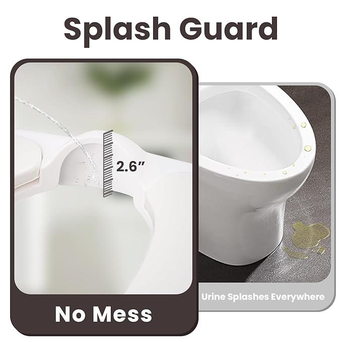 - Comfortable and Easy-Clean Potty Seat: Flat base fits securely on flat toilet rims. Includes splash guard, raised back edge, and adjustable height. Seat removes easily for a quick clean or full rinse