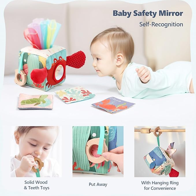 - Multifunctional Design: This ocean-themed baby tissue box toy includes 1 wooden ring, 12 silk scarves, 3 crinkle papers, and 1 baby safety mirror. It also features 4 fun sides: crab, seaweed hiding & finding, whale, seahorse & shell. Perfect for babies aged 6-12 months, this toy offers a variety of sensory experiences ideal for early education.
