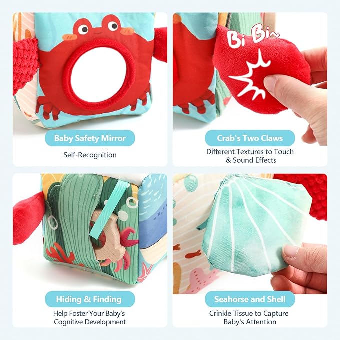 - Multi-Sensory Experience: Designed with crinkle paper, squeaky sounds, and a variety of textures, this toy offers a stimulating multi-sensory experience. The bright colors and varied textures engage your baby’s tactile, auditory, and visual senses, fostering sensory development.