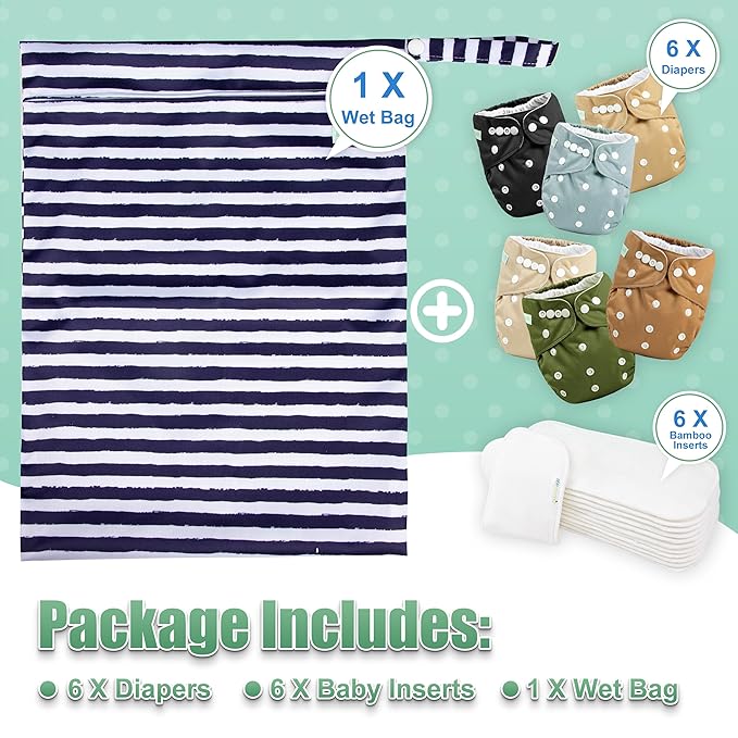 - Thoughtful Package: Including 6 pack of diapers + 6 inserts + 1 wet bag per pack, 6 different modern patterns; Cute stylish prints for boys & girls; It would be ideal products for the newborns and moms