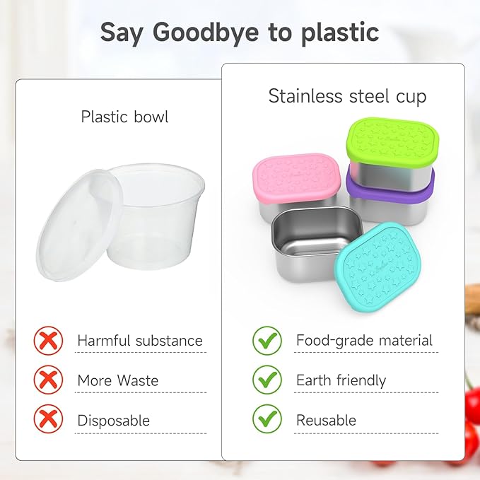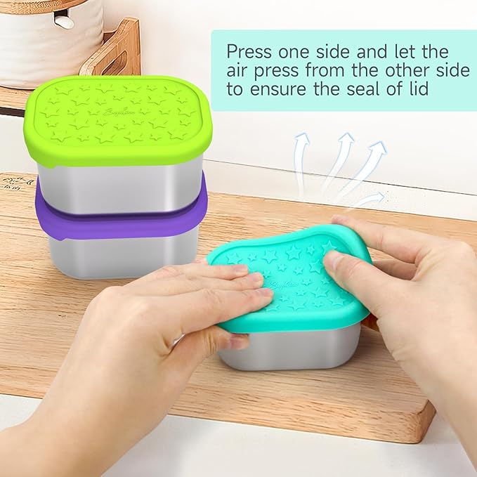 - Food-Grade Material: SOPHICO stainless steel snack containers are made from high-quality 18/8 stainless steel and 100% food-grade silicone. To ensure the standard of our products, the containers comply with CPSC standard by a series of tests. CPSC certified BPA free and non-toxic. Safe, durable and eco-friendly, you can use it without worry.