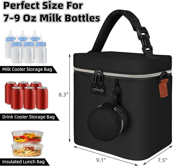 - Large Capacity: This cooler bag comfortably fits up to 6 baby bottles (9 ounces) and still has extra space for additional baby essentials. Ideal for moms who need both breast milk storage and extra room for small necessities.