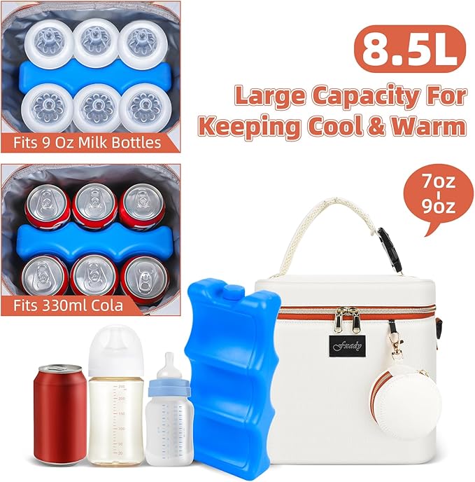 - Large Capacity: This cooler bag comfortably fits up to 6 baby bottles (9 ounces) and still has extra space for additional baby essentials. Ideal for moms who need both breast milk storage and extra room for small necessities.