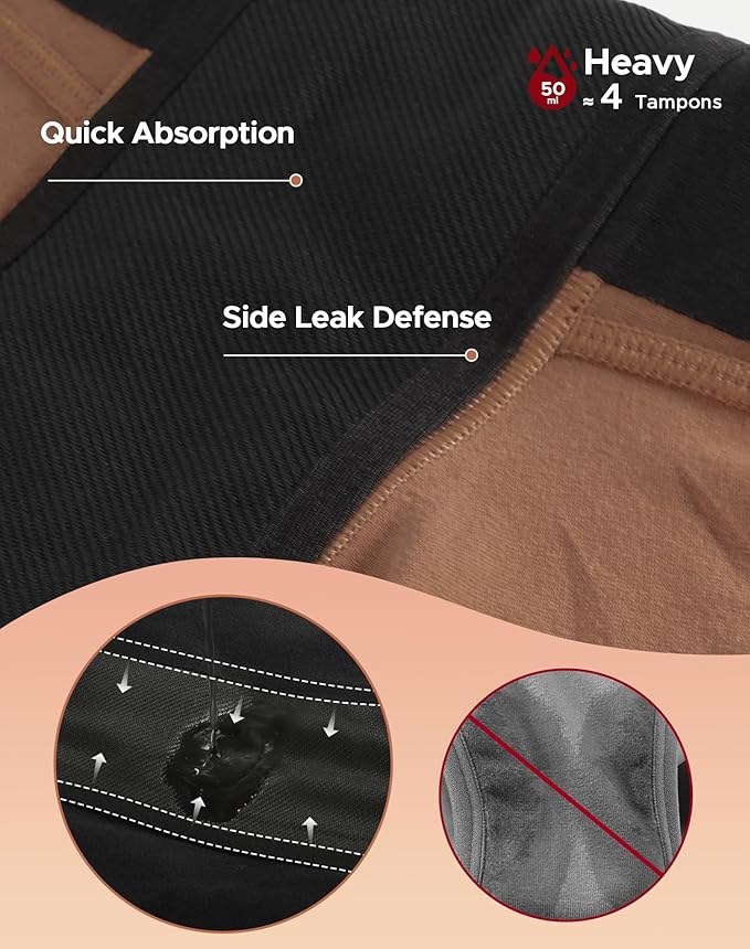 - Super Absorbency: Built-in 4-layer lining, these period underwear for women absorb as much as 4 tampons, which is ideal for moderate to heavy flow days. The extended absorbent layer of leakproof underwear for women provides more reliable leakage protection and prevents soiling of outerwear