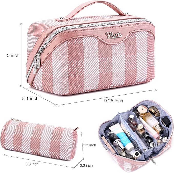 - Large Capacity Travel Cosmetic Bags for Women: The size of cosmetic travel bag is 9.25*5.1*5 inches, fit for 8oz toner or even larger bottles.The size and capacity can easily store cosmetics and skincare toiletries, easy to carry for travelling.