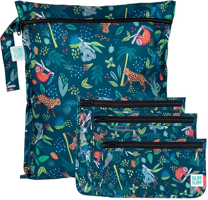 - WET & WET/DRY BAGS - A must-have for parents and travelers alike, Bumkins’ Wet and Wet/Dry Bags are perfect for organizing diapers, baby gear, clothes, toys, toiletries, gym wear, swimwear, and more. This pack comes with one Waterproof Wet Bag and three Clear Travel Bags that are TSA size-compliant and clear-sided (fabric print on one side).