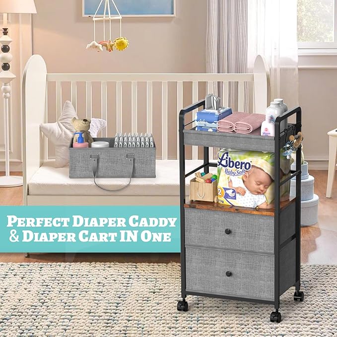 - All-in-One Diaper Organizer with Drawers: The 2-in-1 diaper caddy cart combines open shelves + spacious drawers for smart nursery storage. Keep diapers, wipes, creams, toys, and outfits neatly sorted while the pull-out drawers offer quick access to essentials.The removable top basket doubles as a portable changing caddy for on-the-go convenience.- perfect for multitasking moms who need efficiency!
