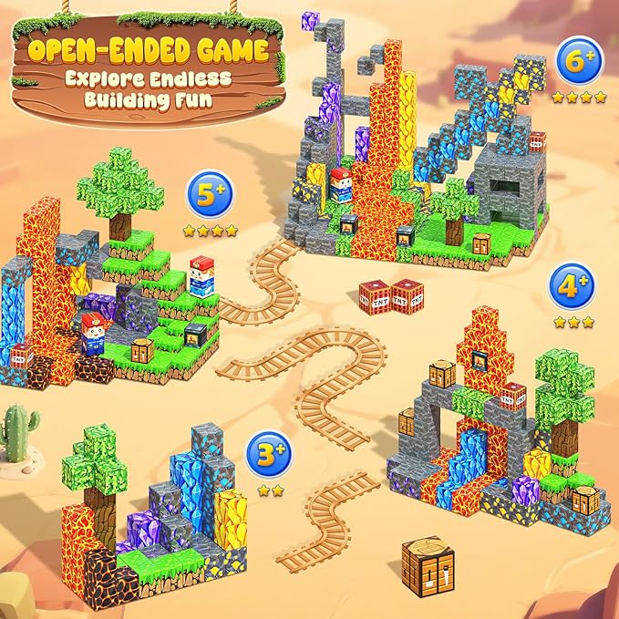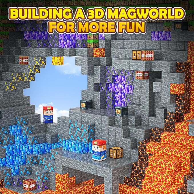 - STEM LEARNING TOYS: Learning through entertainment, the magnet toy is a valuable learning tool for kids aged 3+, and is very suitable for STEM education. The strong magnetism makes the building toys not easy to collapse, and kids can build any simple or complex shapes at will. Forests, mines, and lava can be built into different worlds. Most importantly, the toy can help kids better understand structure, cultivate problem-solving, spatial awareness and fine motor skills