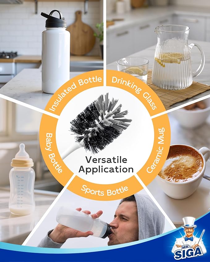 - Dual Function Bristles for Superior Cleaning: MR.SIGA bottle brush features two specialized bristle types for maximum cleaning efficiency. The firm gray bristles at the top power through tough stains and grime in hard to reach areas, while the gentle black bristles clean the inner walls effectively