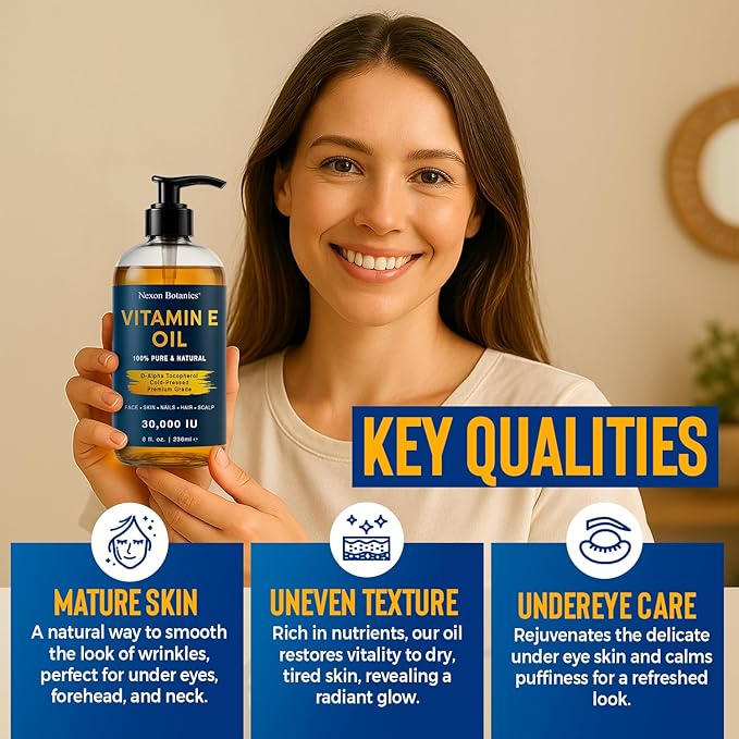 Pure Vitamin E Oil 30,000 IU, 8 fl oz - Cold-Pressed, Hexane Free, Natural Moisturizer for Skin & Face - Supports Scar & Stretch Mark Care by Nexon Botanics