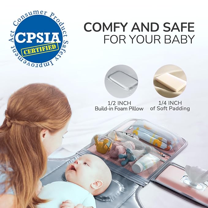 • EASY TO CLEAN AND COMFY FOR BABY. The Alatino Portable Changing Pad is made of premium materials The high-quality padded surface features a built-in ½ inch memory foam pillow to cushion your baby’s head. Also, the waterproof material surface makes it easy to clean with a quick wipe down when messes happen.