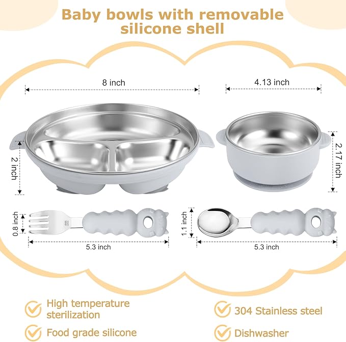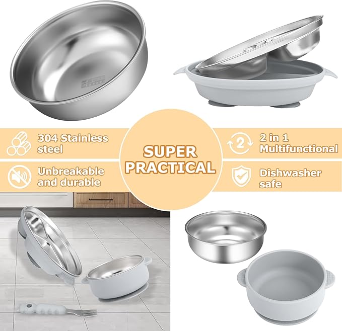 - Innovative 2-in-1 Design: Our stainless steel baby plate and bowls feature a durable stainless steel base combined with a powerful silicone suction shell. Designed to withstand sudden microwave heating, these baby plates eliminate the risk of burns, ensuring your child's meal stays at a safe temperature while the bowl remains securely in place.