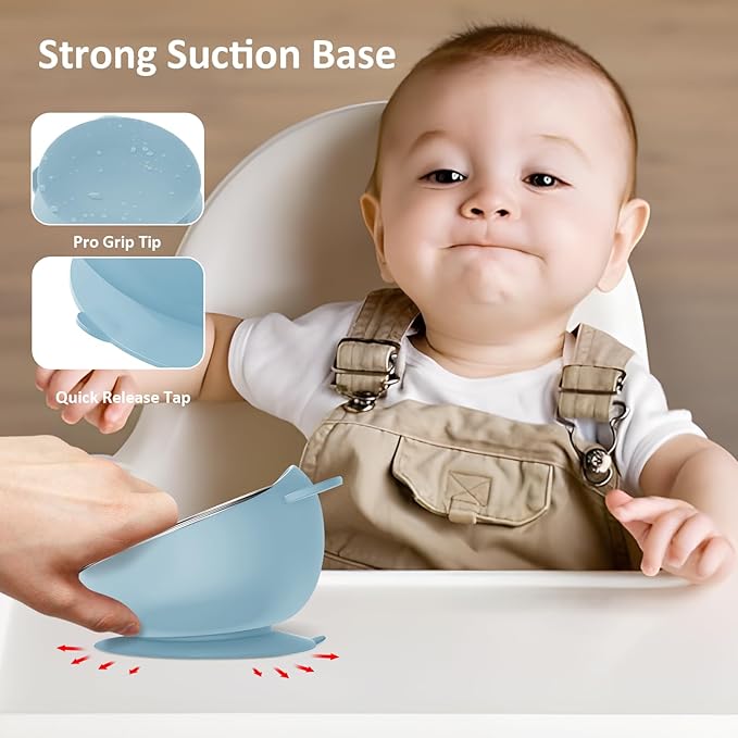 - Strong Suction: The suction bowls for baby sticks securely to highchair trays and clean tables, perfect for reducing overturn by curious little one and freeing mom' s hand for other task. The silicone outer not only prevents burns but also softens noise if dropped and is easy for little hands to grip. And when mealtime is over, the easy-lift tab help releasing