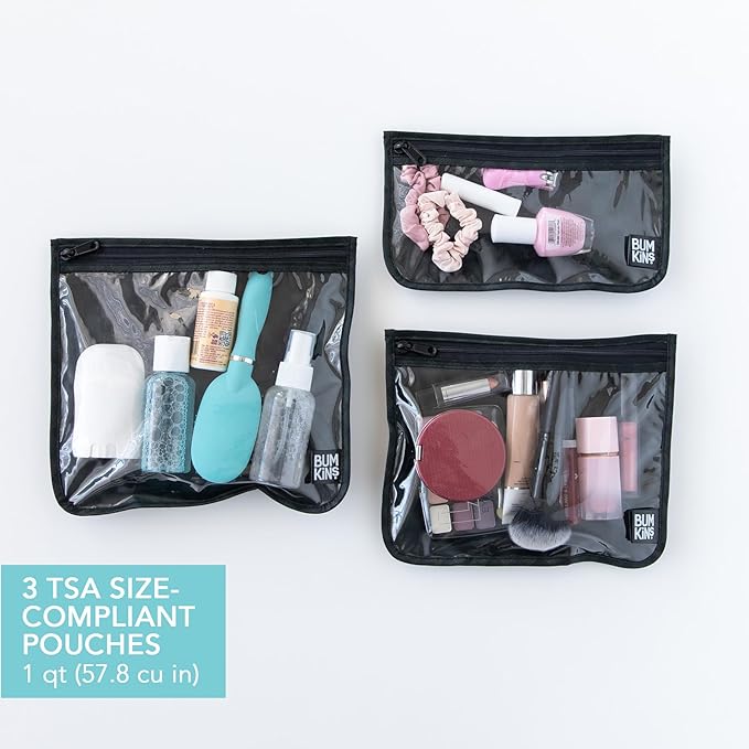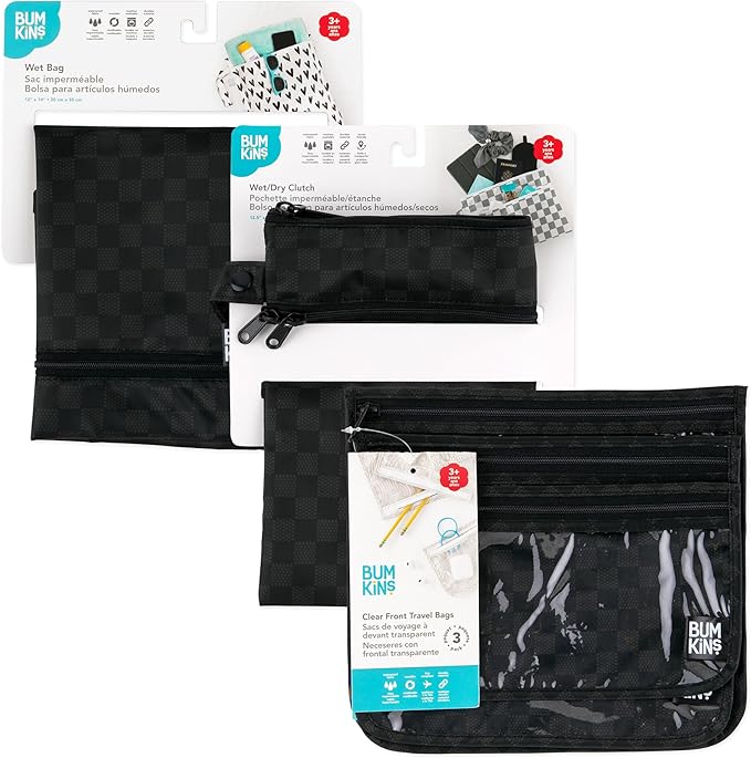 - WET & WET/DRY BAGS - A must-have for parents and travelers alike, Bumkins’ Wet and Wet/Dry Bags are perfect for organizing diapers, baby gear, clothes, toys, toiletries, gym wear, swimwear, and more. This pack comes with one Waterproof Wet Bag, one Waterproof Wet/Dry Clutch and three Clear Travel Bags that are TSA size-compliant and clear-sided (fabric print on one side).