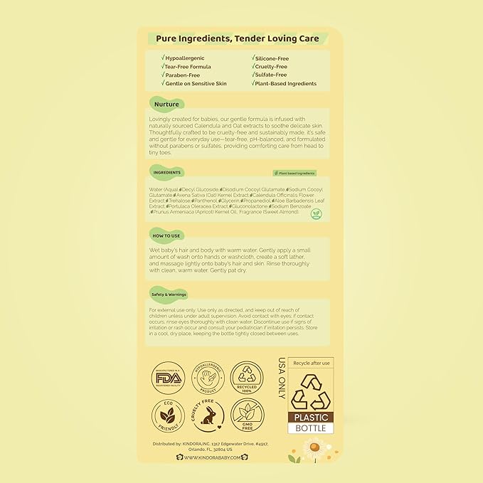 - Plant-Based 2-in-1 Baby Wash for Delicate Skin: Make bath time calm and safe with Kindora’s tear-free baby wash. Crafted with Calendula & Oat, it gently cleanses hair and body without irritation, keeping newborn skin soft, soothed, and happy — the natural care parents can trust.