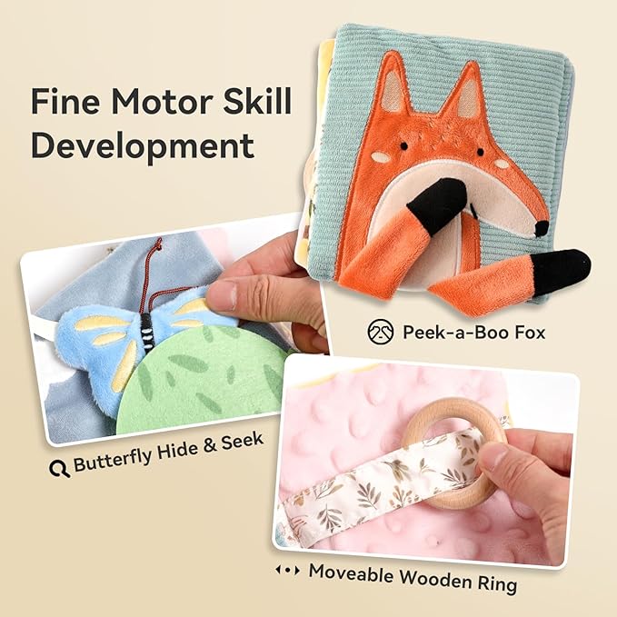 - Montessori-Inspired Sensory Play: Features 8 pages of soft fabrics, textures, and interactive elements like a peek-a-boo butterfly, moving wooden ring, and baby-safe mirror—designed to support cognitive development and early learning.