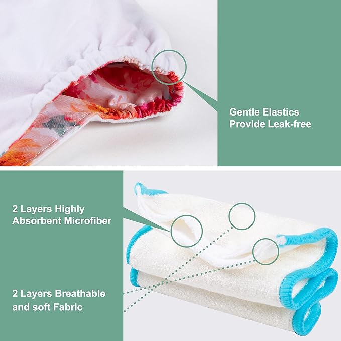 - Absorbent and Soft Insert: Inserts are made of 4 layers fibre, the strong absorbent material with breathability and softness is gentle on your baby’s bottom, keep your baby comfortable and happy; The inner suede cloth touches baby, and wicks moisture away from baby's bottom to the insert