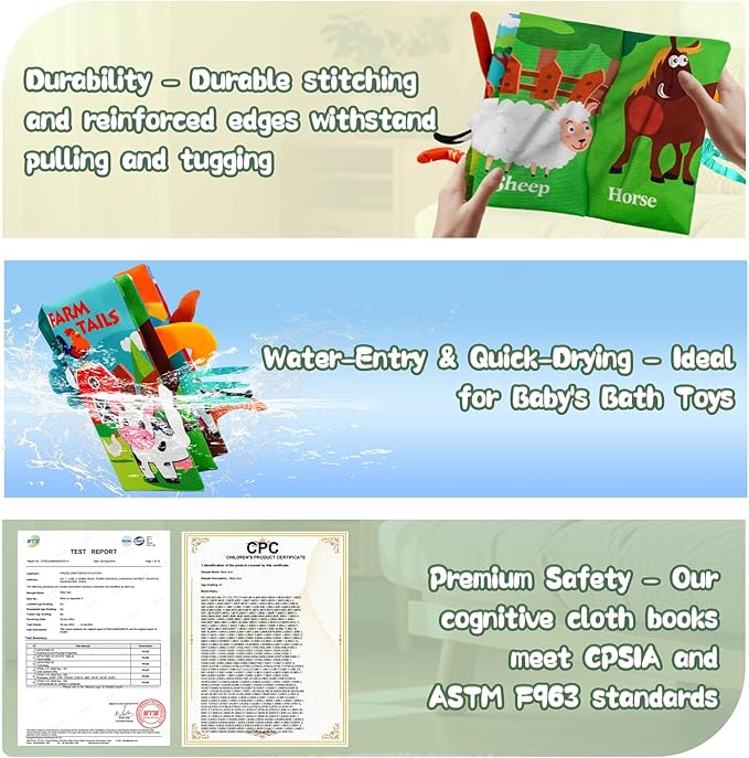 - 【Premium Safety & Durability】Crafted with baby-safematerials, this tear-proof cloth book survives bites, throws, and washes. No loose parts, and machine-washable fabric ensure worry-free play. A must-have baby essential for 0-12 months, combining sensory fun and educational value in one giftable package.