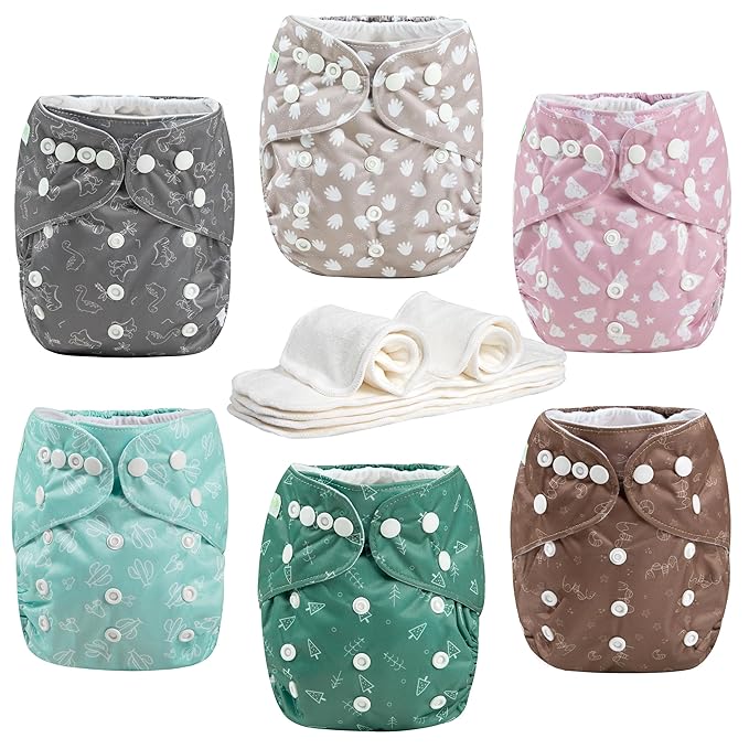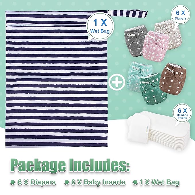 - Thoughtful Package: Including 6 pack of diapers + 6 inserts + 1 wet bag per pack, 6 different modern patterns; Cute stylish prints for boys & girls; It would be ideal products for the newborns and moms