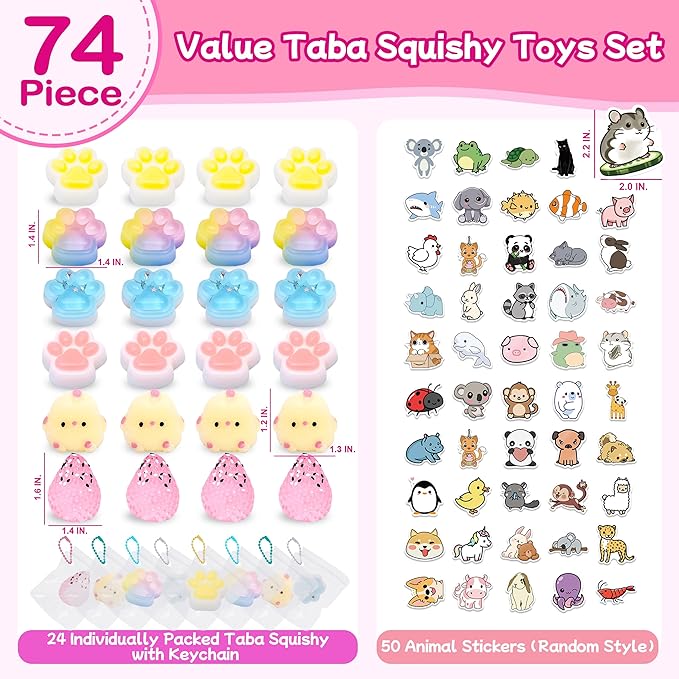 - 【74piece Taba Squishy pack】The Taba Squishy pack includes 24 pack cute taba squishies (4Taba Squishy Chick +16 Taba Squishy Paw+4 Strawberry Taba Squishy Strawberry) with 50 animal stickers.Each taba squishy toy has its own Portable Chain Pouches,ready for decorating with cute animal stickers that can also be applied to water bottles, notebooks and more for versatile use.Kids loved these taba squishy toys at the school egg hunt and in the classroom treasure box. If you are looking for bulk party favors,classroom prizes or goodie bag stuffers for kids,this taba squishy pack is a great pick!