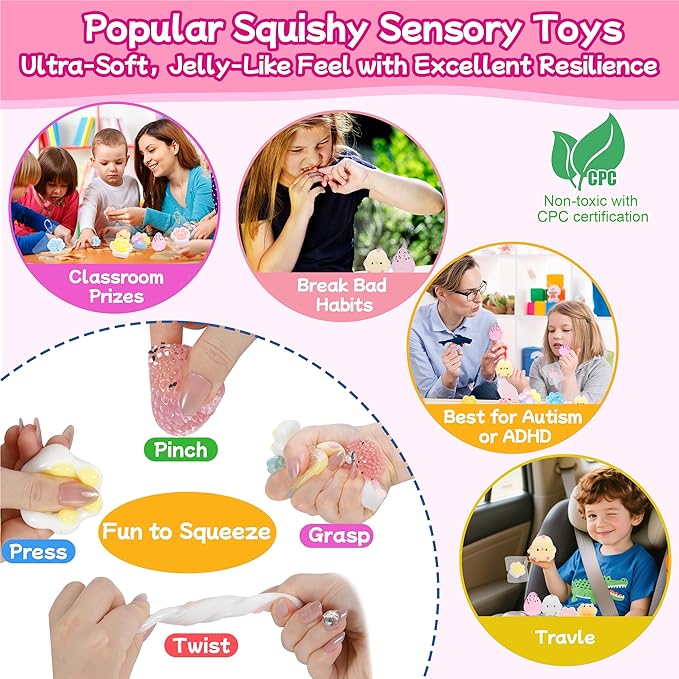 - 【Upgraded Material & Certified Safety 】This taba squishy pack Made with new upgraded, BPA free, odorless,CPC-certified non-toxic material. These taba squishy fisget toys are Ultra-soft, jelly-like feel with excellent resilience. Durable, won't break or deform easily.You can squeezed, kneaded, stretched.Even if repeated kneading can maintain stable elasticity,They are reliable Squishy sensory fidget toys as calm down corner supplies.