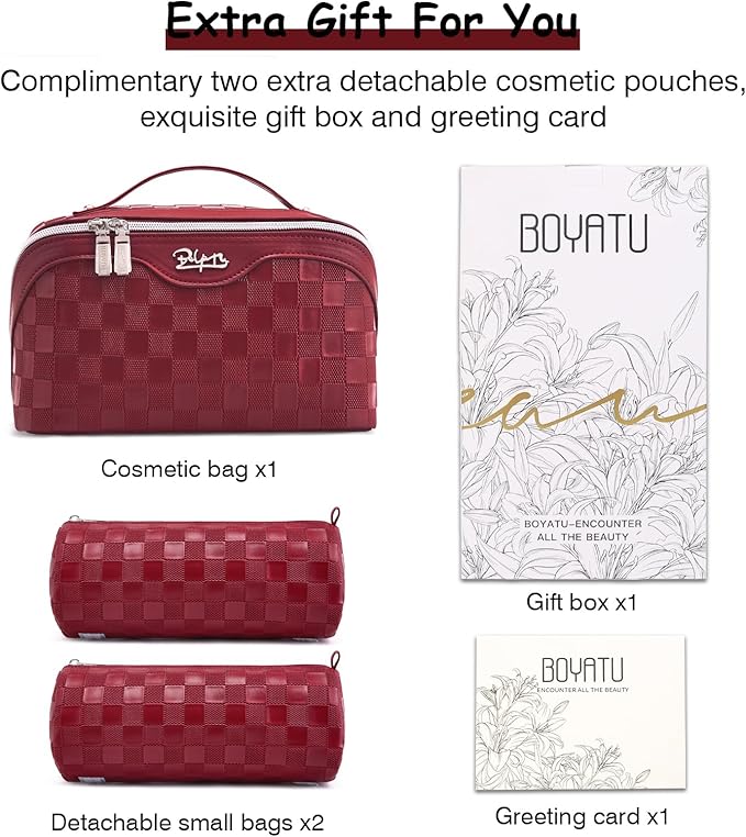 - Travel Makeup Bag Set of 3: This BOYATU travel makeup bag with five compartments comes with two small makeup pouches, ensuring optimal organization for your skincare products and cosmetics. Nice for your travel, business trips, vacations, outdoor activities and picnics.