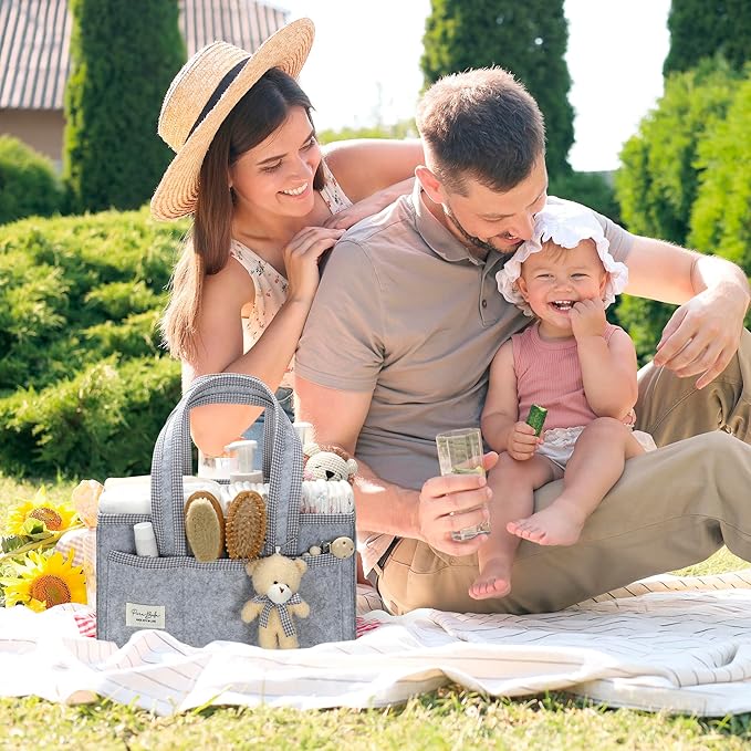 - STYLISH DESIGN AND BONUS TEDDY BEAR CHARM: Crafted with a premium felt exterior, your nursery decor with our neutral diaper organizer. It feels cozy & functional and it looks great on changing table and dresser. The caddy has 8 sturdy outer pockets for ample baby storage and a bonus teddy bear charm, adding a touch of delight