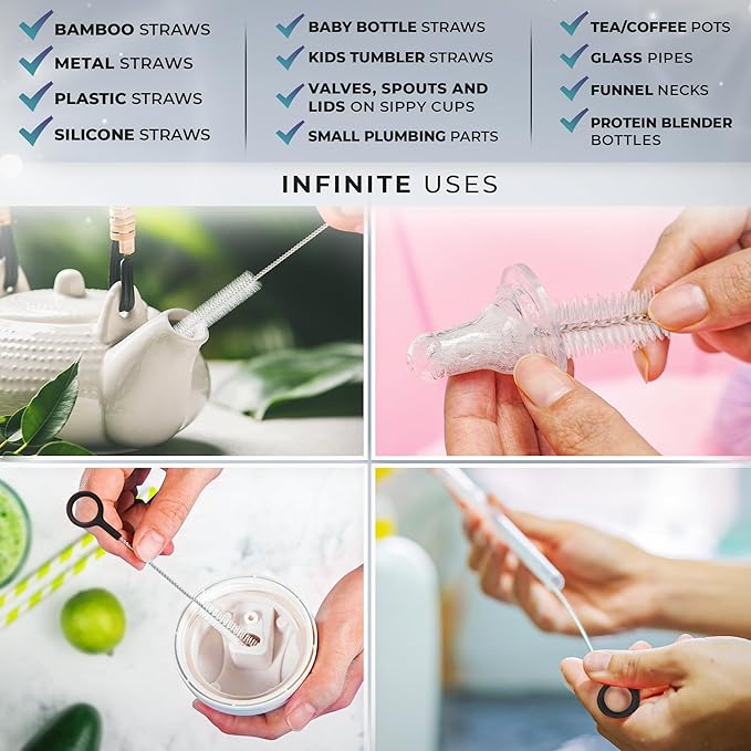 - MULTI-PURPOSE - Many different uses apart from reusable straw cleaner brush(plastic, metal, silicone, bamboo). Other uses include cleaning small bottles, food processor and various kitchen appliances parts, test tubes, funnel necks, small plumbing pipes and other hard to access corners, precision tools, tea pot or coffee pots, sippy cup medicine dispenser, perculator, cpap tubes, glass pipes. Can also be used for various tumblers like Yeti, Tervis, Rtic, Bubba, Ozark, Klean Kanteen.