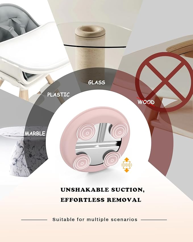 - Before You Buy: Designed for hassle-free use! The suction base sticks best on clean, smooth, and flat surfaces — like highchair trays, glass, or polished tables. Skip the textured or wooden ones — they don’t hold suction well. For a stronger grip, just press down the center to push the air out. And before you buy, make sure your tray’s flat area fits the plate!