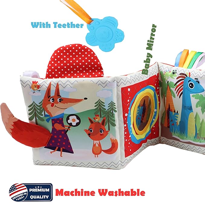 • Tummy Time Toys with Mirror: This is a double-sided soft book featuring six unique panels. One side showcases black and white high-contrast illustrations, perfect for newborns aged 0-6 months as they are naturally drawn to bold patterns, supporting early visual and pattern recognition. The reverse side offers colorful illustrations designed for the next stage of development, when your baby’s vision matures, and they can fully recognize and enjoy vibrant colors.