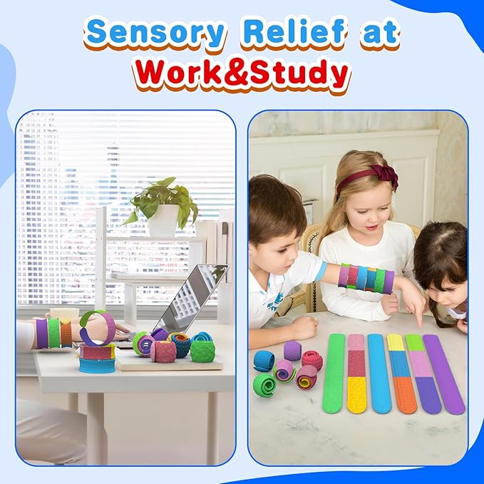 - Textured Fidget Bracelets for Classroom: Are you looking for fidget items for hands and fingers? Putting these small sensory fidget toys into desk to help ease busy hands and minds.Our ADHD-friendly textured slap bracelets provide calming tactile input to help ease busy hands and restless minds.sensory slap bracelets securely to desks and captures kids' attention with its vibrant rainbow colors.