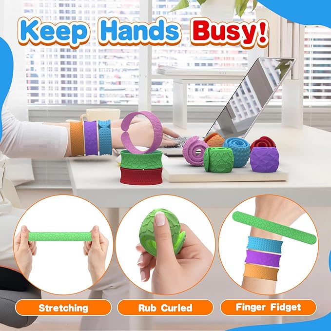 - Textured Fidget Bracelets for Classroom: Are you looking for fidget items for hands and fingers? Putting these small sensory fidget toys into desk to help ease busy hands and minds.Our ADHD-friendly textured slap bracelets provide calming tactile input to help ease busy hands and restless minds.sensory slap bracelets securely to desks and captures kids' attention with its vibrant rainbow colors.