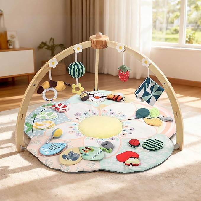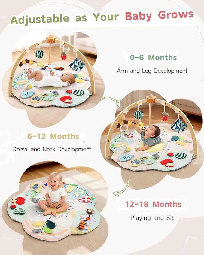 - 【Wood Gym & 4 Developmental Toys】: Our ultra-stable wooden baby gym frame safely suspends four engaging toys: a Cloth Book for Visual & Cognitive development, a Bee Rattle for Hearing stimulation, a Strawberry Plush for Sensory exploration, and a Watermelon Ball for Visual & Tactile skills. This complete baby play gym mat set is expertly designed for developmental fun