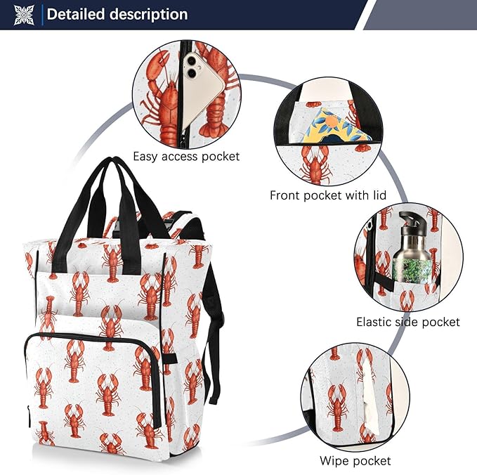 Emelivor Lobsters Red White Diaper Bag Backpack Large Capacity with Insulated Pockets Baby Bag Diaper Bags for Boy Girl Unisex Baby Women Travel
