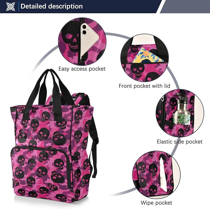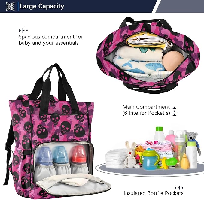 Emelivor Skull Pink Camouflage Diaper Bag Backpack Large Capacity with Insulated Pockets Baby Bag Diaper Bags for Boy Girl Travel Mom Women Men