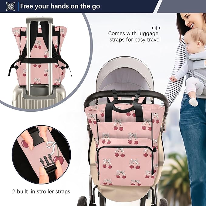 Emelivor Cherries Bow Pink Diaper Bag Backpack Large Capacity with Insulated Pockets Baby Bag Diaper Bags for Boy Girl Travel Shopping Mom Dad