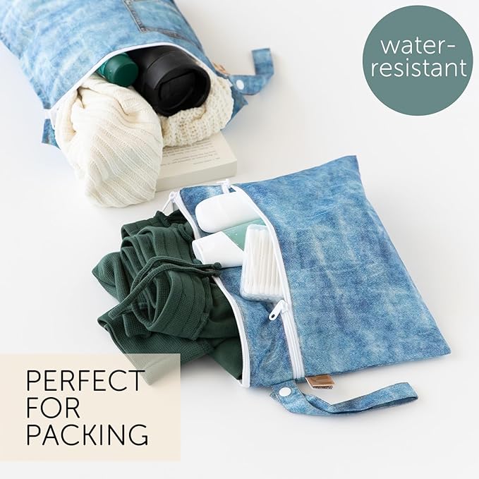 Bumkins Roamio Waterproof Wet Bag & Wet/Dry Clutch Set, Reusable Travel Organizers for Swim, Beach, Gym, Baby Gear, Cloth Diapers, Pump Parts, Pool, Toiletries, Machine Washable, Faux Denim 2-Pack