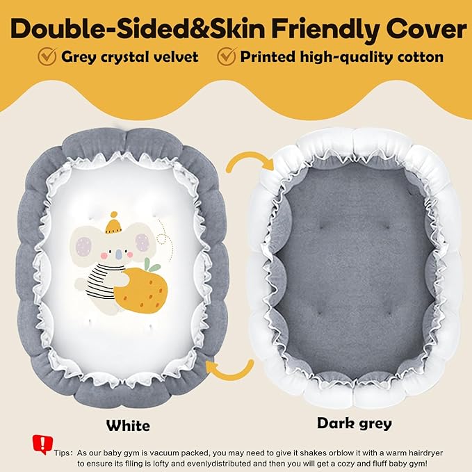 - SAFE DOUBLE-SIDED BABY PLAY MAT: This baby toy mat for the baby activity center prioritizes the safety of the baby. The side with cute patterns is made of high-quality cotton fabric, while the pure color side is made of high-quality crystal velvet material. It can be used on both sides. The design has no sharp edges or harmful substances, providing a safe play space.