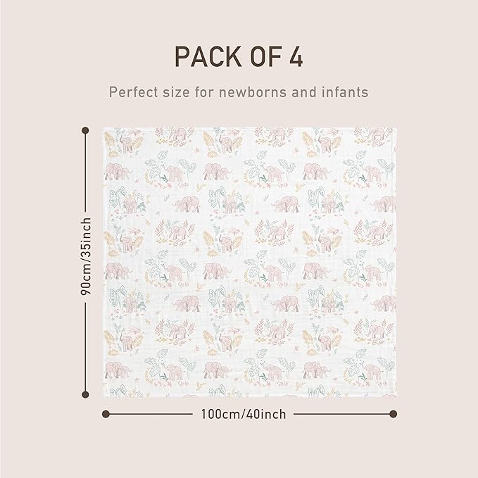 GLLQUEN BABY Muslin Swaddle Blankets 4-Pack Breathable Receiving Blankets (35" x 40") Soft Baby Blankets for Girls and Boys Newborn Essentials Muslin Burp Cloths Swaddle Wrap Baby Gift(Pink Elephant)